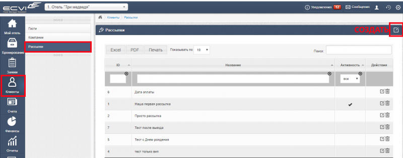 Описанные ниже функции недоступны отелям,пользующимся системой на тарифе Light. Перейдите на тариф Optimum или выше, если вы хотите использовать Рассылки.