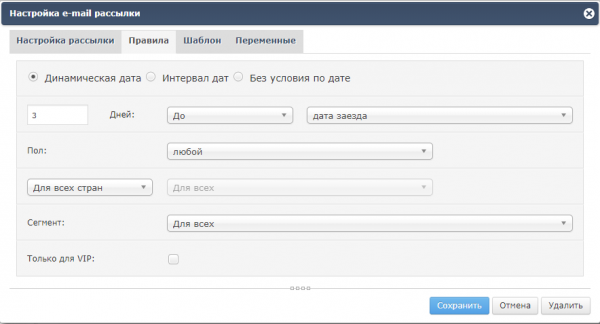 Динамическая дата. Подразумевает создание условия типа <сколько-то> дней ДО или ПОСЛЕ даты заезда или даты выезда или даты брони (даты создания бронирования в системе) или даты оплаты (даты первого платежа на счете) или дня рождения гостя. Совместно с этим типом правила лучше создавать рассылки с периодичностью «день», т.е. такие, которые запускаются в системе ежедневно. Чтобы никого из гостей не пропустить ведь условие, что до заезда осталось, к примеру, 3 дня, сработает для брони только в определенную дату.