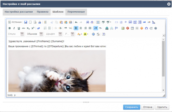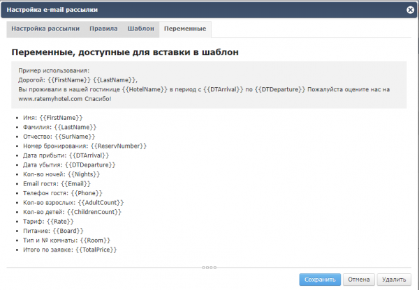 На закладке Шаблон создается само тело письма. Здесь, во-первых, имеется специальная панель кнопок, с помощью которых можно оформить письмо не как простой текст, а как красивую страницу (для этого, возможно, придется освоиться с некоторыми базовыми понятиями HTML, но и без них кое-что можно сделать…). Во-вторых, в текст письма можно вставлять специальные «переменные», которые в итоговом письме автоматически превратятся в ФИО гостя, его номер комнаты, даты заезда и пр. Эти переменные перечислены на закладке Переменные: