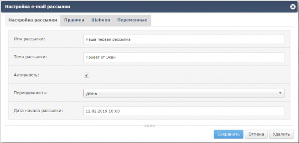 При создании или редактировании открывается окно «Настройка e-mail рассылки», которое позволяет задать все необходимые параметры