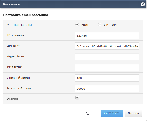 На этой иллюстрации показан вариант настройки, если вы самостоятельно зарегистрировались в сервисе рассылок (и получили там данные для подключения ID и API_KEY, а также ограничения для своего тарифного плана). Единственное, что всегда доступно - флажок Активность. Если он не установлен, никакие рассылки, даже созданные ранее, отправляться не будут.
