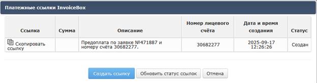 Система откроет окно "Платежные ссылки InvoiceBox", в котором будет выводиться информация о ранее сформированных ссылках и так же возможность сформировать новую ссылку по кнопке "Создать ссылку":