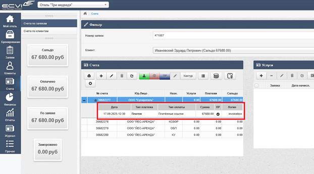 В случае успешной оплаты в ECVI на счёте отобразится платежная операция.