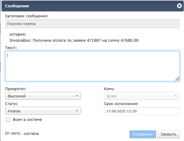 При каждой успешно совершенной платежной операции в системе будет выводиться уведомление о факте получения оплаты.