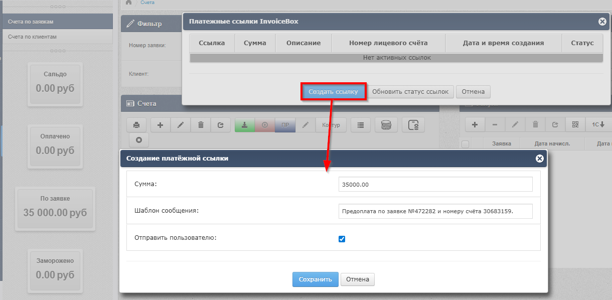 После выполнения указанных выше настроек в системе становится доступна функция формирования платёжной ссылки.