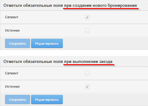 Администрирование - Отель - Настройка обязательных полей, состоит из 4 блоков (начиная с декабря 2025 - из 6 блоков), предназначенных для разных режимов создания гостей и компаний, а так же обязательность заполнения поля Сегмент и Источник в Карточке заявки: