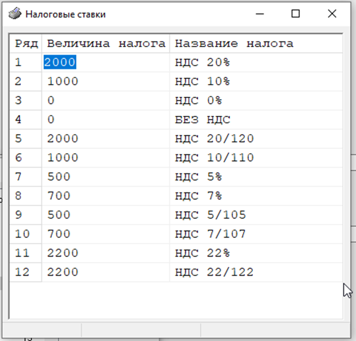 Значение в первом столбце и будет значением позиции для указанной в третьем столбце налоговой ставки. Это значение нужно указать в файле конфигурации модуля:
