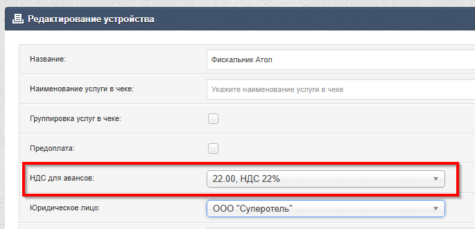 Если необходимо изменить налоговую ставку для Авансовых платежей(которые не привязаны к услугам), в разделе Администрирование - Устройства - Фискальные регистраторы в свойствах устройства