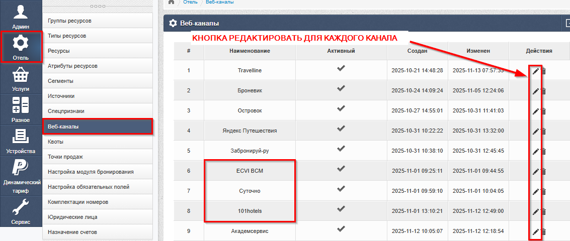 Администрирование -> Отель -> Веб-каналы -> и по кнопке