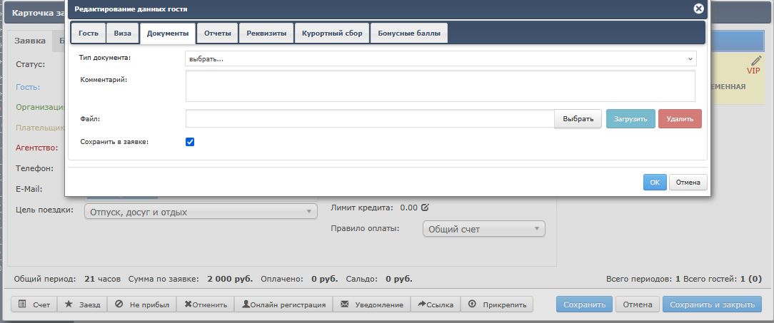 Также можно прикрепить фото или скан паспорта (2 файла). Которые также отобразятся в карточке гостя во вкладке "Документы"