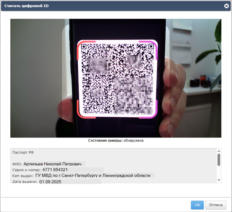 По клику на кнопку "Считать цифровой ID" будет осуществляться обращение к локально подключенной веб-камере для считывания QR-кода. При успешном сканировании пользователь увидит блок с распознанными данными и сможет подставить их в поля профайла гостя: