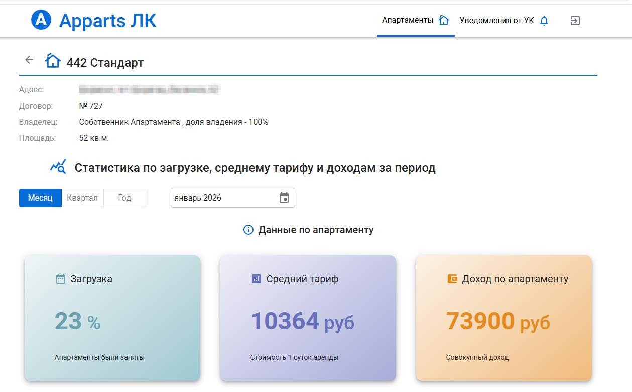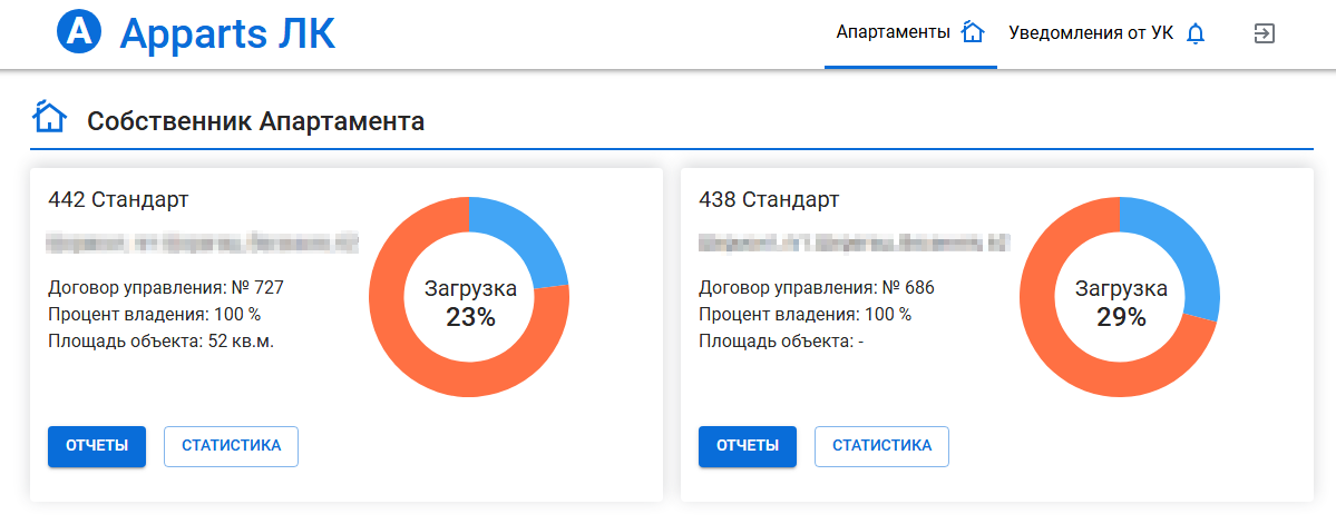 Если во владении собственника несколько апартаментов, то по каждому объекту собственник может сформировать отчеты и просмотреть статистику: